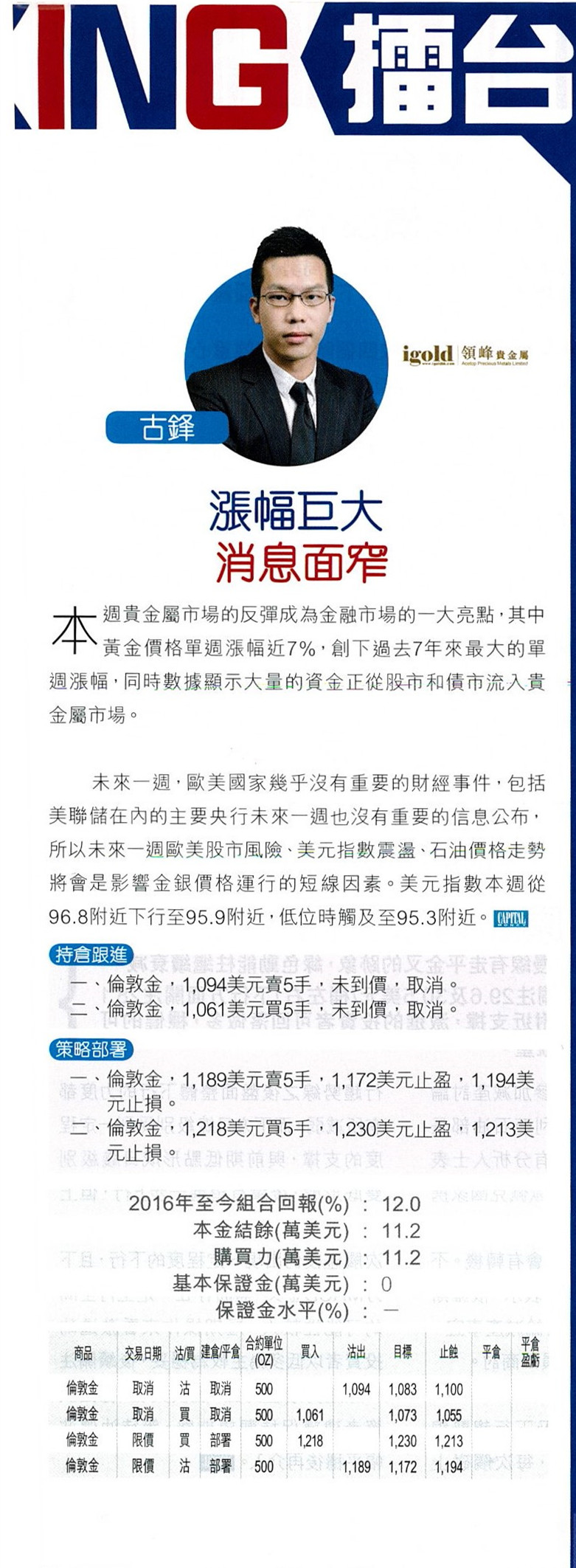 一、伦敦金,1094美元卖5手,未到价,取消。