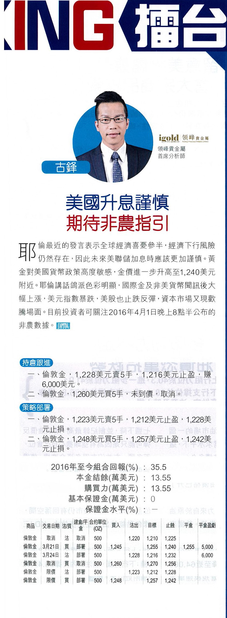 耶伦最近的发言表示全球经济喜忧参半,经济下行风险仍然存在,因此未来美联储加息时应该更加谨慎。黄金对美国货币政策高度敏感,金价进一步升高至1240美元附近。耶伦讲话鸽派色彩明显,国际金及非美货币闻讯后大幅上涨,美元指数暴跌,美股也止跌反弹,资本市场又现欢腾场面。目前投资者可关注2016年4月1日晚上8点半公布的非农数据。