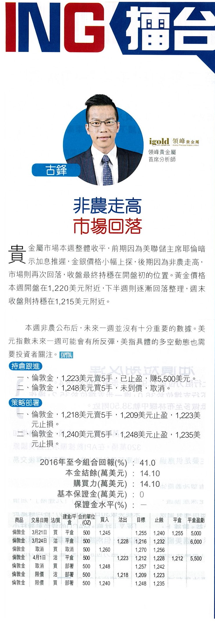 贵金属市场本周整体收平,前期因为美联储主席耶伦暗示加息推迟,金银价格小幅上探,后期因为非农走高,市场则再次回落,收盘最终持稳在开盘初的位置。黄金价格本周开盘在1220美元附近,下半周则逐渐回落整理,周末收盘则持稳在1215美元附近。
