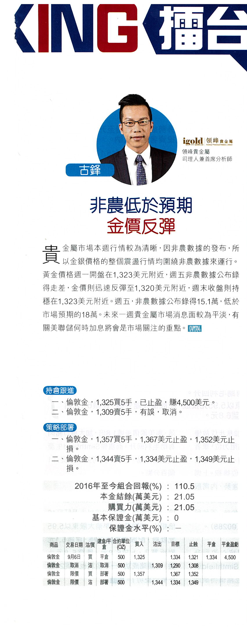 贵金属市场本周行情较为清晰,因为非农数据的发布,所以金银价格的整个震荡行情均围绕非农数据来运行。黄金价格周一开盘在1323美元附近,周五非农数据公布录得走差,金价则迅速反弹至1320美元附近,周末收盘则持稳在1323美元附近。周五,非农数据公布录得15.1万,低于市场预期的18万。未来一周贵金属市场消息面较为平淡,有关美联储何时加息将会是市场关注的重点。