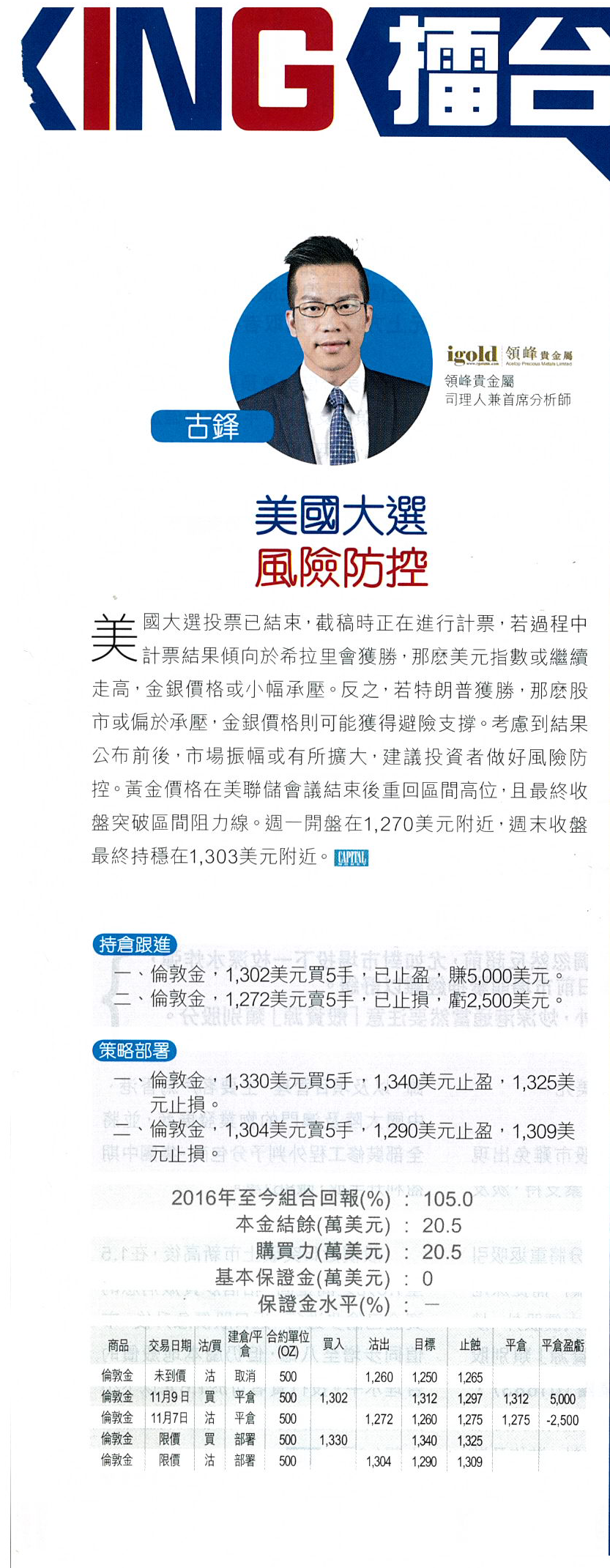 美国大选投票已结束,截稿时正在进行计票,若过程中计票结果倾向于希拉里会获胜,那么美元指数或继续走高,金银价格或小幅承压。反之,若特朗普获胜,那么股市或偏于承压,金银价格则可能获得避险支撑。考虑到结果公布前后,市场振幅或有所扩大,建议投资者做好风险防控。黄金价格在美联储会议结束之后重回区间高位,而且最终收盘突破了区间阻力线。周一开盘在1270美元附近,周末收盘最终持稳在1303美元附近。