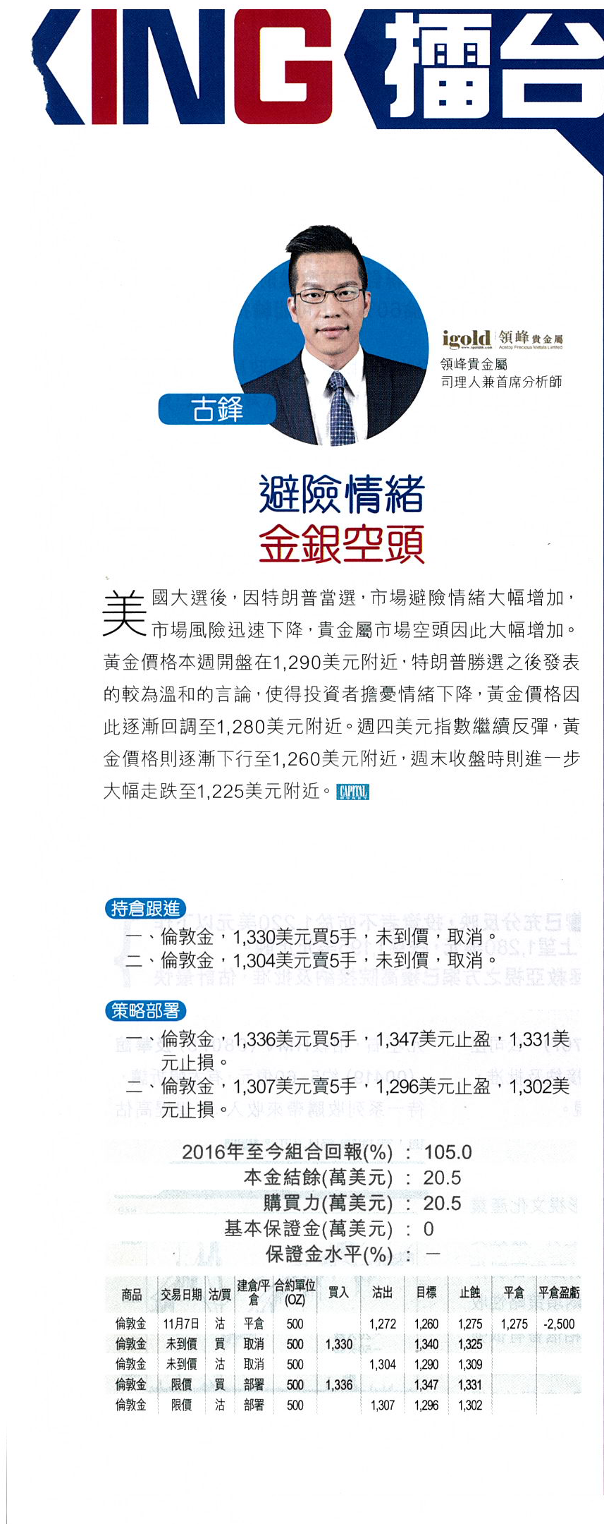 美国大选之后,因特朗普当选,市场避险情绪大幅增加,市场风险迅速下降,贵金属市场空头因此大幅增加。黄金价格本周开盘在1290美元附近,特朗普胜选之后发表的较为温和的言论,使得投资者担忧情绪下降,黄金价格因此逐渐回调至1280美元附近。周四美元指数继续反弹,黄金价格则逐渐下行至1260美元附近,周末收盘时则进一步大幅走跌至1225美元附近。