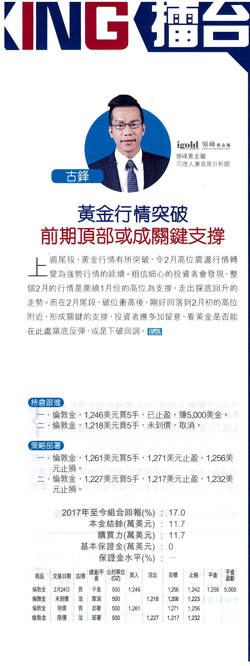 一、伦敦金,1261美元买5手,1271美元止盈,1256美元止损。
