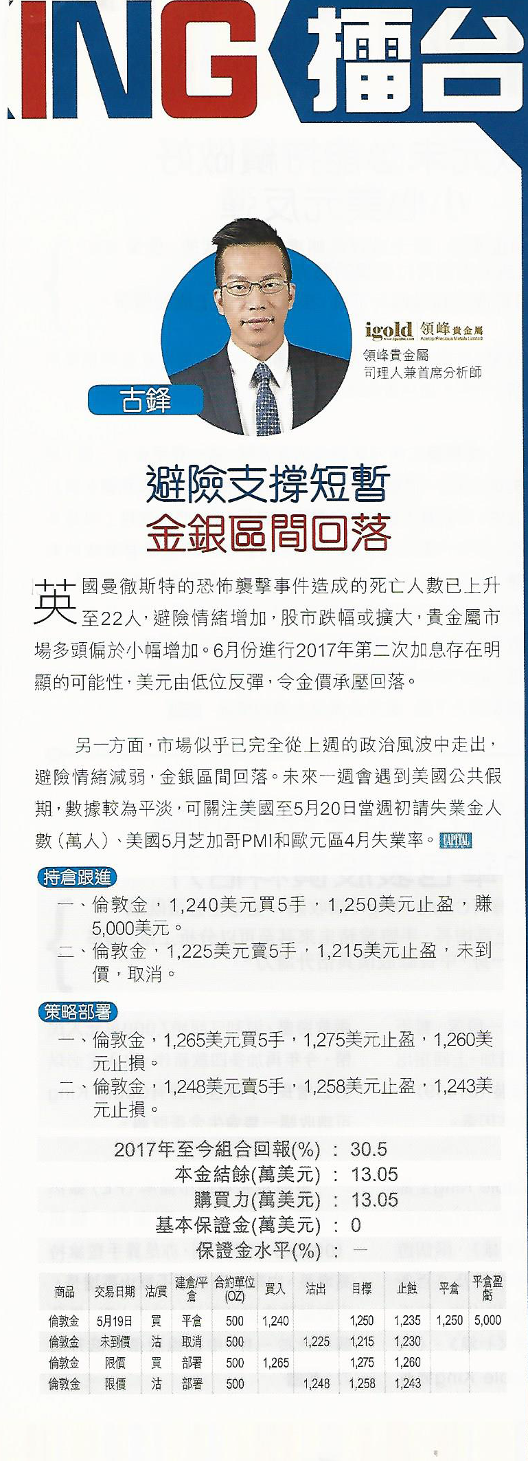 英国曼彻斯特的恐怖袭击事件造成的死亡人数已经上升至22人,避险情绪增加,股市跌幅或扩大,贵金属市场多头偏于小幅增加。6月份进行2017年第二次加息存在明显的可能性,美元由低位反弹,令金价承压回落。