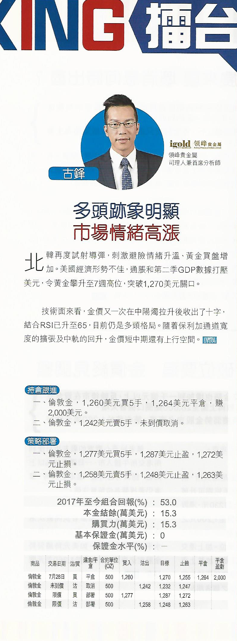 二、伦敦金,1,258美元卖5手,1,248美元止盈,1,263美元止损。