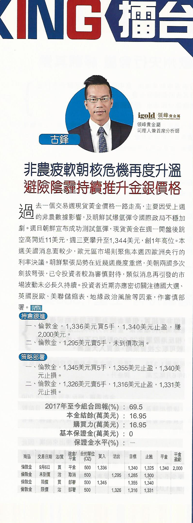 过去一个交易周现货黄金价格一路走高,主要因受到上周的非农数据影响,及朝鲜试爆氢弹令国际政局不稳加剧。周日朝鲜宣布成功测试氢弹,现货黄金在周一开盘后跳空高开近11美元,周三更攀升至1344美元创1年高位。