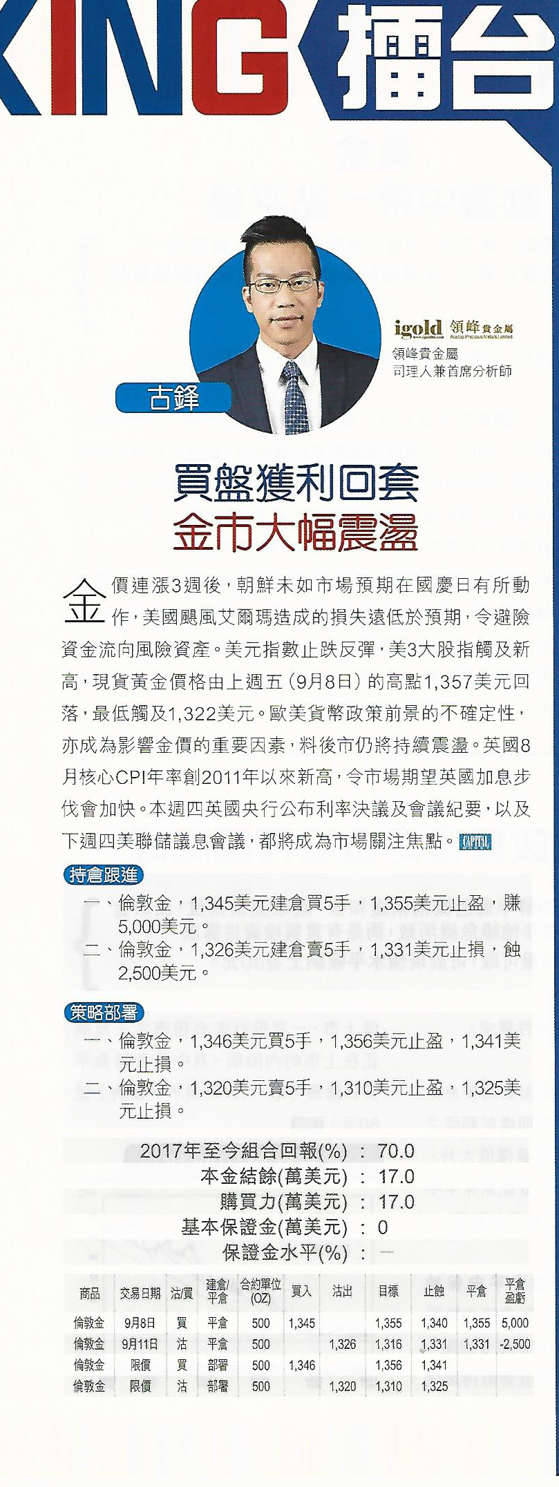 金价连涨3周后,朝鲜未如市场预期在国庆节有所动作,美国飓风艾尔玛造成的损失远低于预期,令避险资金流向风险资产。美元指数止跌反弹,美3大股指触及新高,现货黄金价格由上周五(9月8日)的高点1357美元回落,最低触及1322美元。欧美货币政策前景的不确定性,近来亦成为影响金价的重要因素,料后市仍将持续震荡。本周二公布的英国8月核心CPI年率创2011年以来新高,令市场期望英国加息步伐会加快。本周四英国央行公布利率决议及会议纪要,以及下周四美联储议息会议,都将成为市场关注焦点。