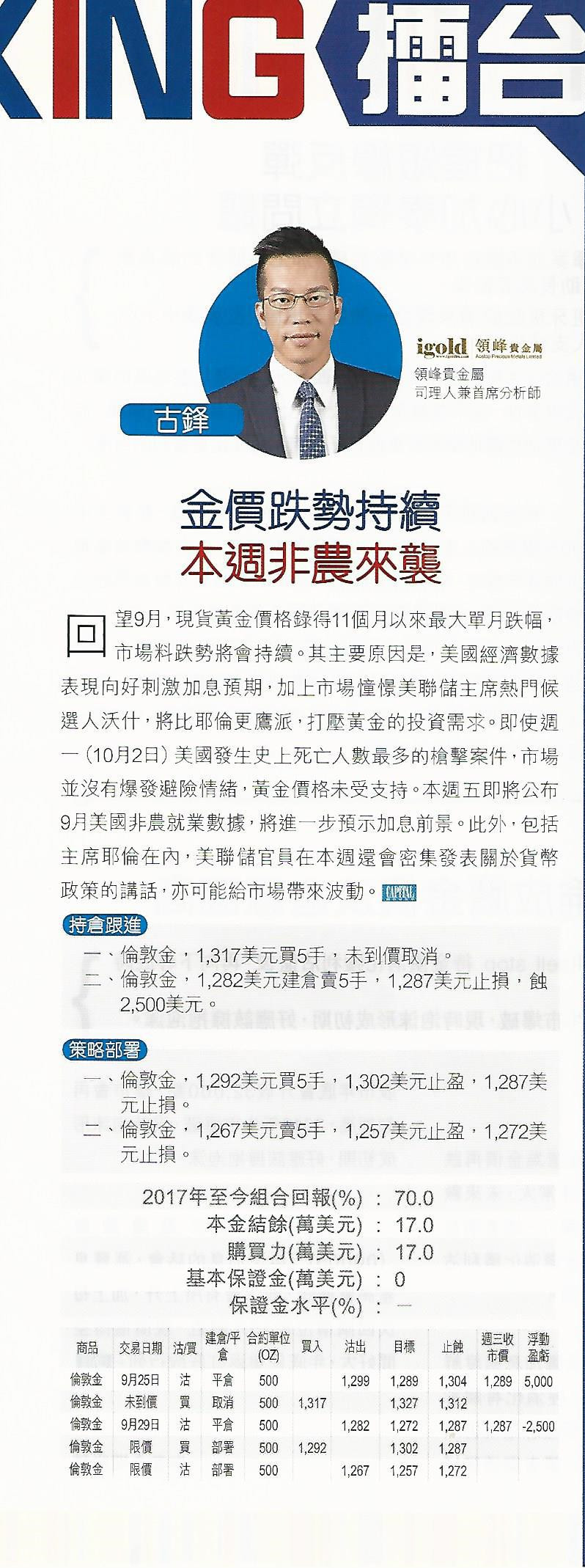 回望9月,现货黄金价格录得11个月以来最大单月跌幅,市场料跌势将会持续。其主要原因是,美国经济数据表现向好刺激加息预期,加上市场憧憬美联储主席热门候选人沃什,将比耶伦更鹰派,打压黄金的投资需求。即使周一(10月2日)美国发生史上死亡人数最多的枪击案件,市场并没有爆发避险情绪,黄金价格未受支持。本周五即将公布9月美国非农就业数据,将进一步预示加息前景。此外,包括主席耶伦在内,美联储官员在本周还会密集发表关于货币政策的讲话,亦可能给市场带来波动。
