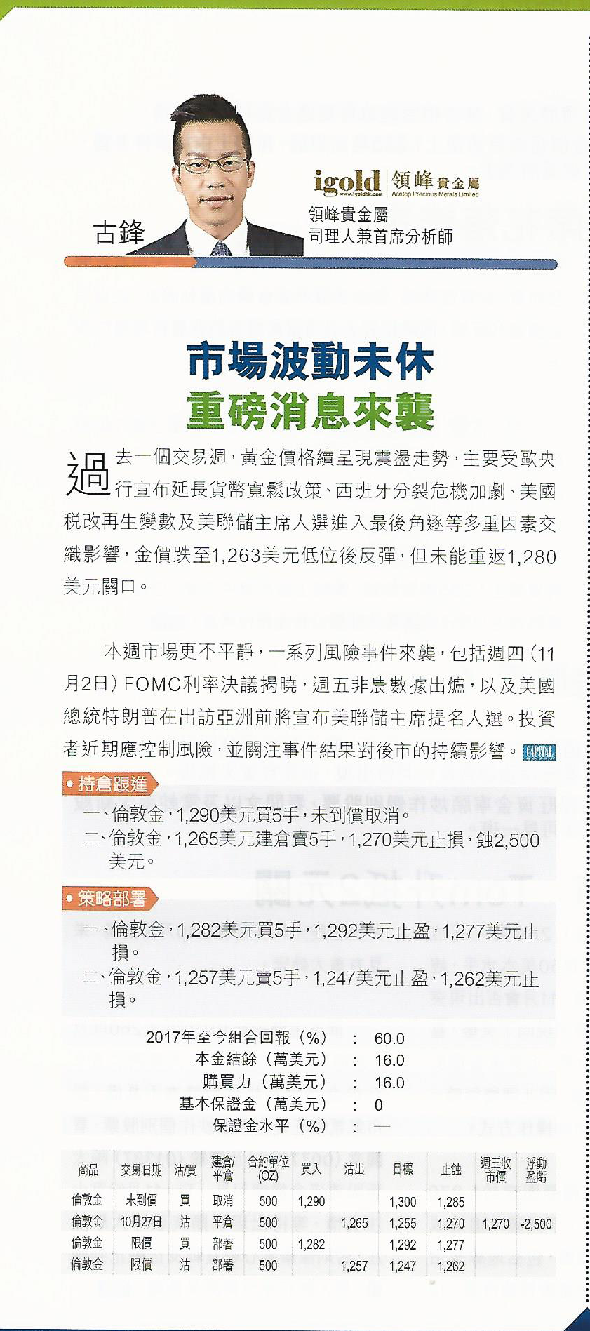 二、伦敦金,1,265美元建仓卖5手,1,270美元止损,蚀2,500美元。