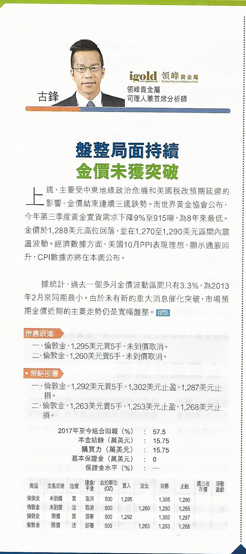 上周,主要受到中东地缘政治危机和美国税改预期延迟的影响,金价结束连续三周跌势。而世界黄金协会(WGC)公布,今年第三季度黄金实货需求下降9%至915吨,为8年以来最低。金价于1,288美元高位回落,并在1,270至1,290美元区间内震荡波动。经济数据方面,美国10月PPI表现理想,显示通胀回升,CPI数据亦将在本周公布。