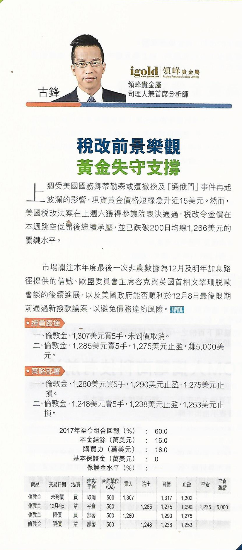 上周受美国国务卿蒂勒森或遭撤换及「通俄门」事件再起波澜的影响,现货黄金价格短线急升近15美元。然而,美国税改法案在上周六获得参议院表决通过,税改令金价在本周跳空低开后继续承压,并已跌破200日均线1,266美元的关键水平。