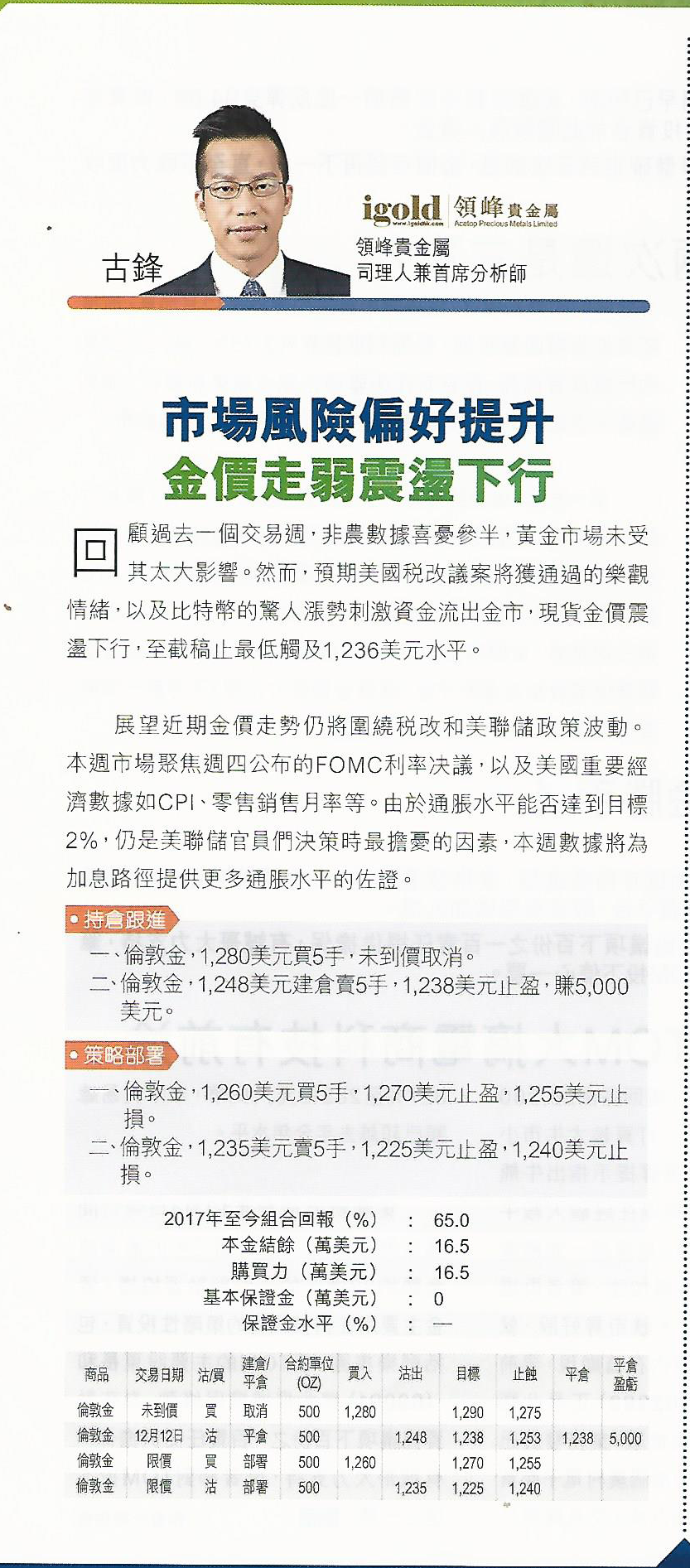 回顾过去一个交易周,非农数据喜忧参半,黄金市场未受其太大影响。然而,预期美国税改议案将获通过的乐观情绪,以及比特币的惊人涨势刺激资金流出金市,现货金价震荡下行,至截稿止最低触及1,236美元水平。