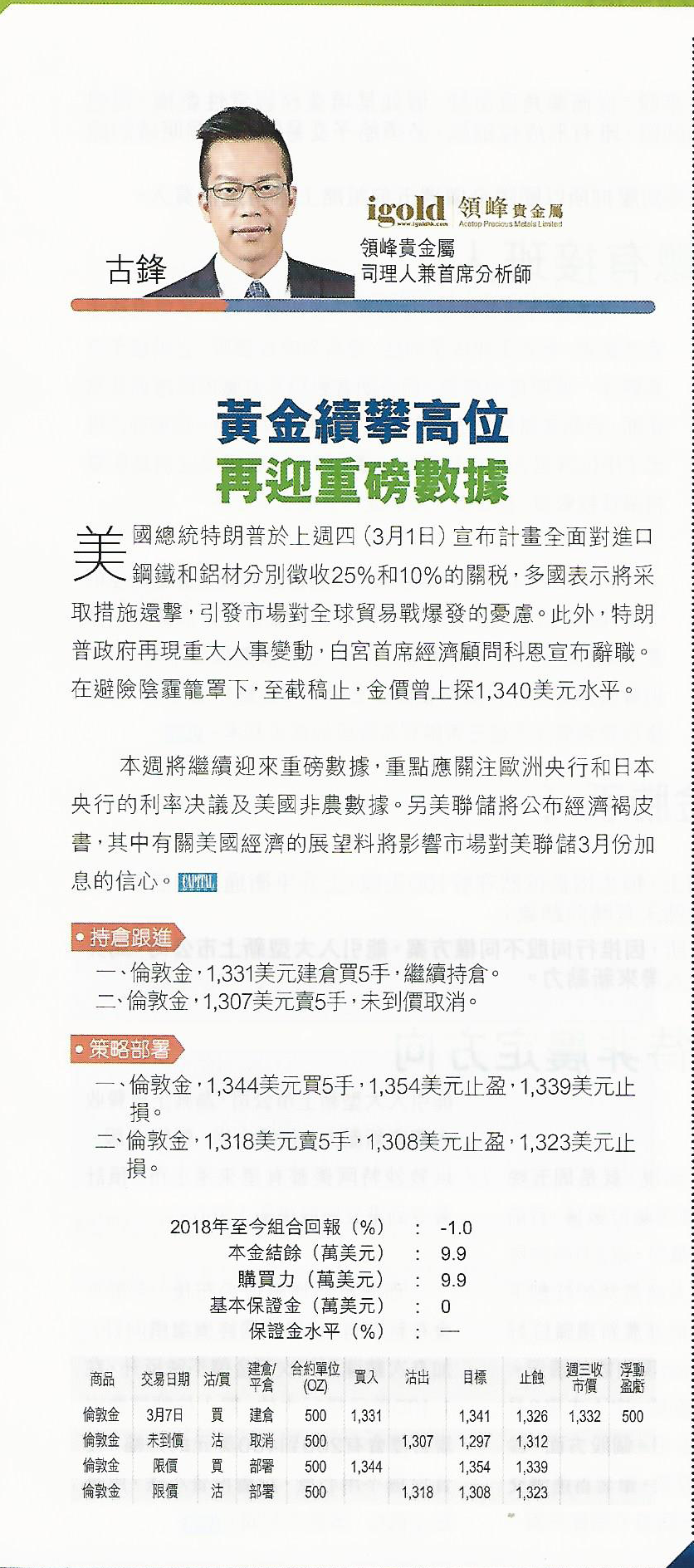 美国总统特朗普于上周四(3月1日)宣布计划全面对进口钢铁和铝材分别征收25%和10%的关税,多国表示将采取措施还击,引发市场对全球贸易战爆发的忧虑。此外,特朗普政府再现重大人事变动,白宫首席经济顾问科恩宣布辞职。在避险阴霾笼罩下,至截稿止,金价曾上探1,340美元水平。