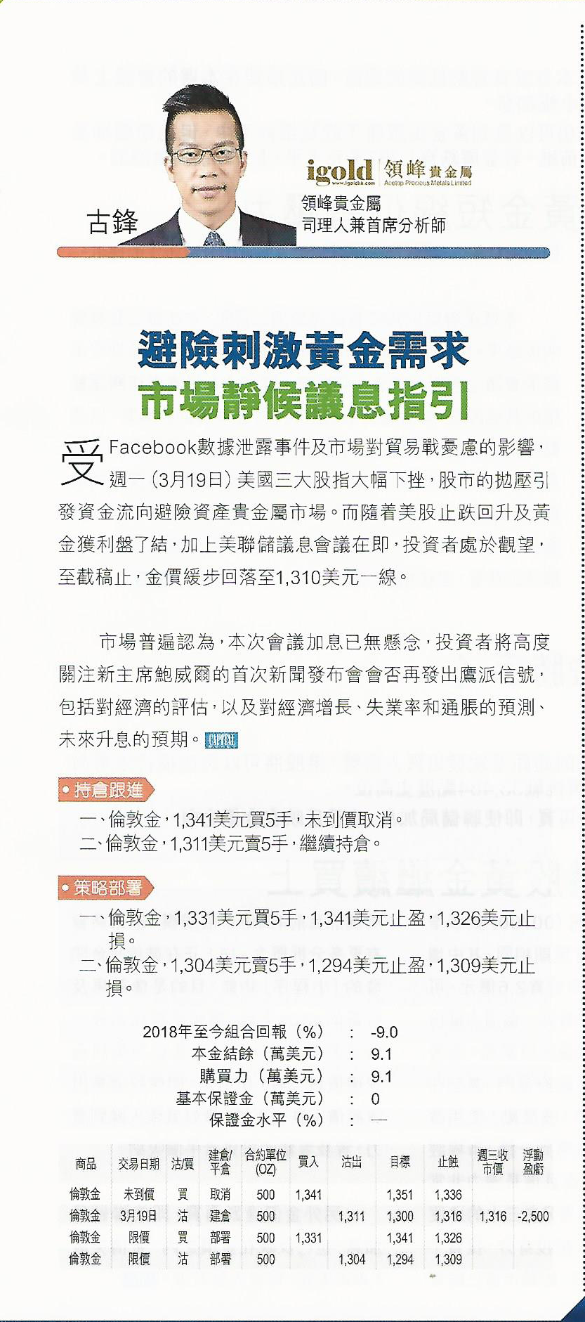 受Facebook数据泄露事件及市场对贸易战忧虑的影响,周一(3月19日)美国三大股指大幅下挫,股市的抛压引发资金流向避险资产贵金属市场。而随着美股止跌回升及黄金获利盘了结,加上美联储议息会议在即,投资者处于观望,至截稿止,金价缓步回落至1,310美元一线。市场普遍认为本次会议加息已无悬念,投资者将高度关注新主席鲍威尔的首次新闻发布会会否再发出鹰派信号,包括对经济的评估,以及对经济增长、失业率和通胀的预测、未来升息的预期。