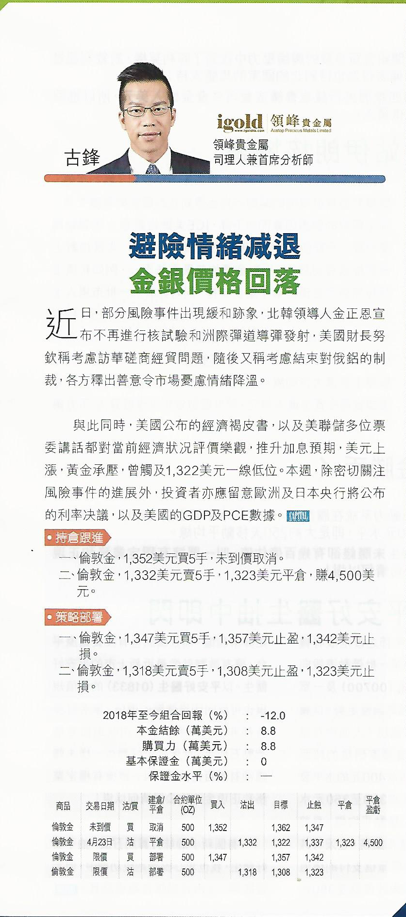 与此同时,美国公布的经济褐皮书,以及美联储多位票委讲话都对当前经济状况评价乐观,推升了加息预期,美元上涨,黄金承压,曾触及1,322美元一线低位。本周,除了密切关注风险事件的进展外,投资者亦应留意欧洲及日本央行将公布的利率决议,以及美国的GDP及PCE数据。