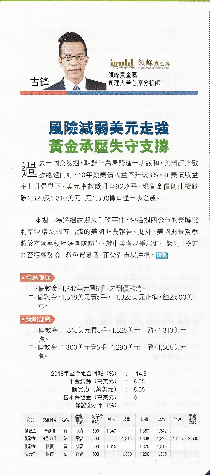 过去一个交易周,朝鲜半岛局势进一步缓和,美国经济数据总体向好,10年期美债收益率升破3%。在美债收益率上升的带动下,美元指数飙升至92水平,现货金价则连续跌破1,320及1,310美元,距1,300关口仅一步之遥。