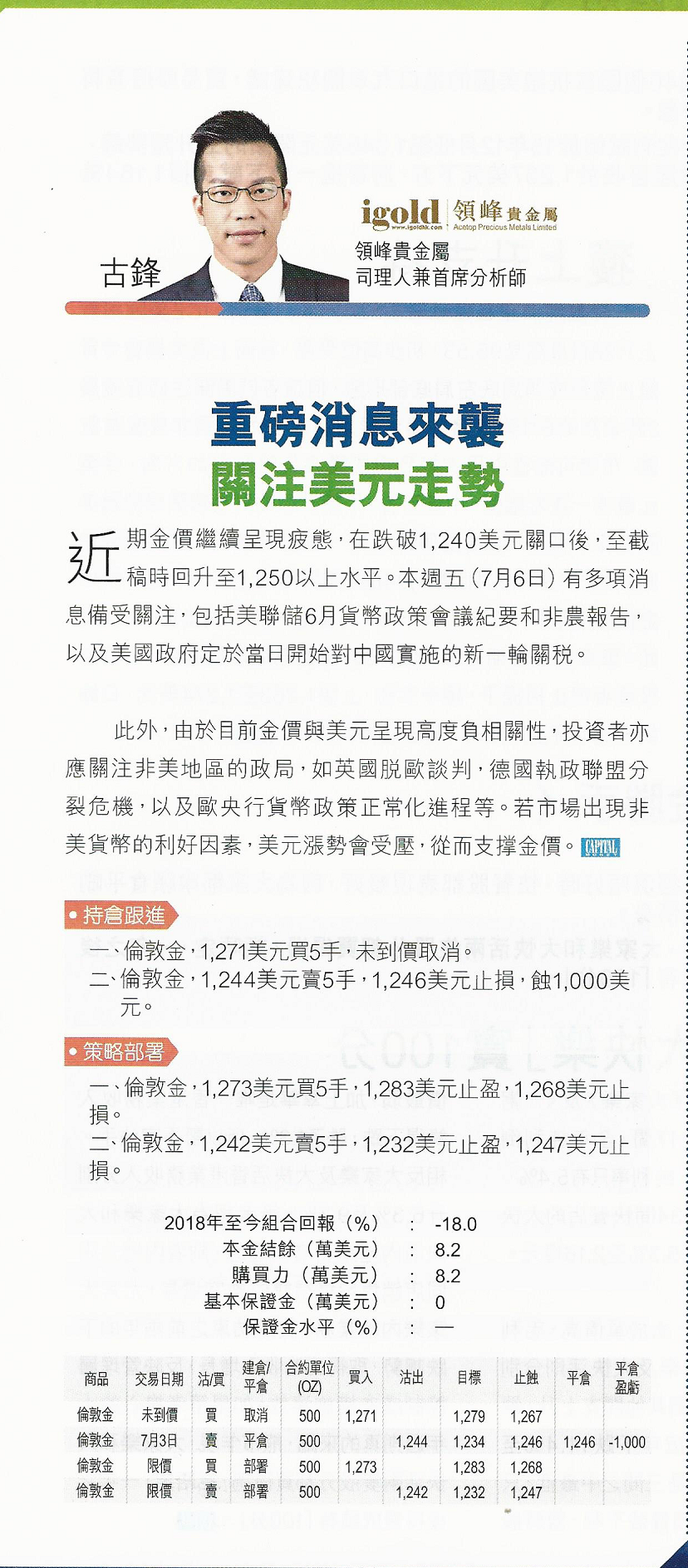 近期金价继续呈现疲态,在跌破1,240美元关口后,至截稿时回升至1,250以上水平。本周五(7月6日)有多项消息备受关注,包括美联储6月货币政策会议纪要和非农报告,以及美国政府定于当日开始对中国实施的新一轮关税。此外,由于目前金价与美元呈现高度负相关性,投资者亦应关注非美地区的政局,如英国脱欧谈判,德国执政联盟分裂危机,以及欧央行货币政策正常化进程等。若市场出现非美货币的利好因素,美元涨势会受压,从而支撑金价。
