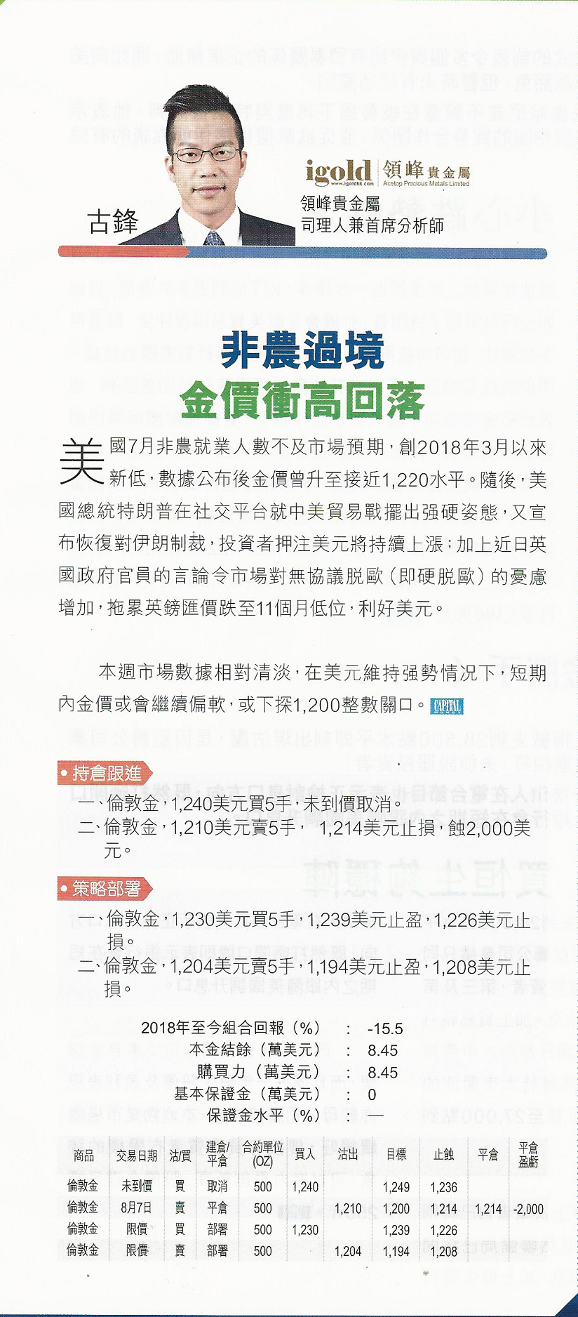 一、伦敦金,1,240美元买5手,未到价取消。
