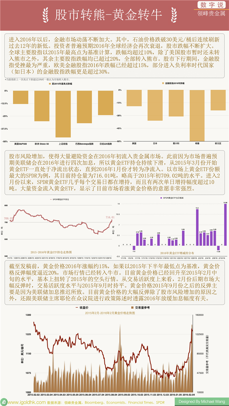 全球股市进入2016年便不断走跌,其中导火索在于新兴市场经济和石油价格。2016年第一个交易日,中国股市开盘便熔断,随后因为二次熔断中国证监会不得不取消熔断机制。开局不利使得中国股市风险持续增加,在不到2个月的时间里,上证综指跌幅已经超过20%。与此同时,中国GDP持续下滑,人民币持续贬值,投资者对中国经济的担忧加剧。市场担心如果中国经济硬着陆,整个新兴市场经济会陷入像1999年亚洲金融危机一样的衰退。悲观情绪不断蔓延,使得新兴市场股票也不断走跌。除了新兴市场经济衰退导致股市下跌之外,石油价格的持续下跌也是股市转入熊市的重要原因。