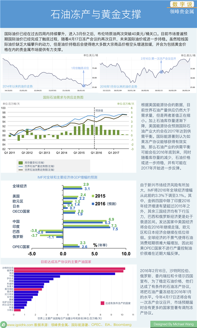 根据上文“数字说”中的介绍,目前有4个国家已经签署了有条件的冻产协议,未来在4月份新一次的冻产会议中,可能会有更多的国家加入。在今年2月16日沙特和俄罗斯官员会晤商讨冻产的消息导致油价一度飙升6%,但随后正式发布的声明导致油价急剧回落,因为交易员们认为该协议不会让市场显著减少石油供应。不过进入3月份随着冻产协议的逐渐实施,国际油价则进一步持稳。