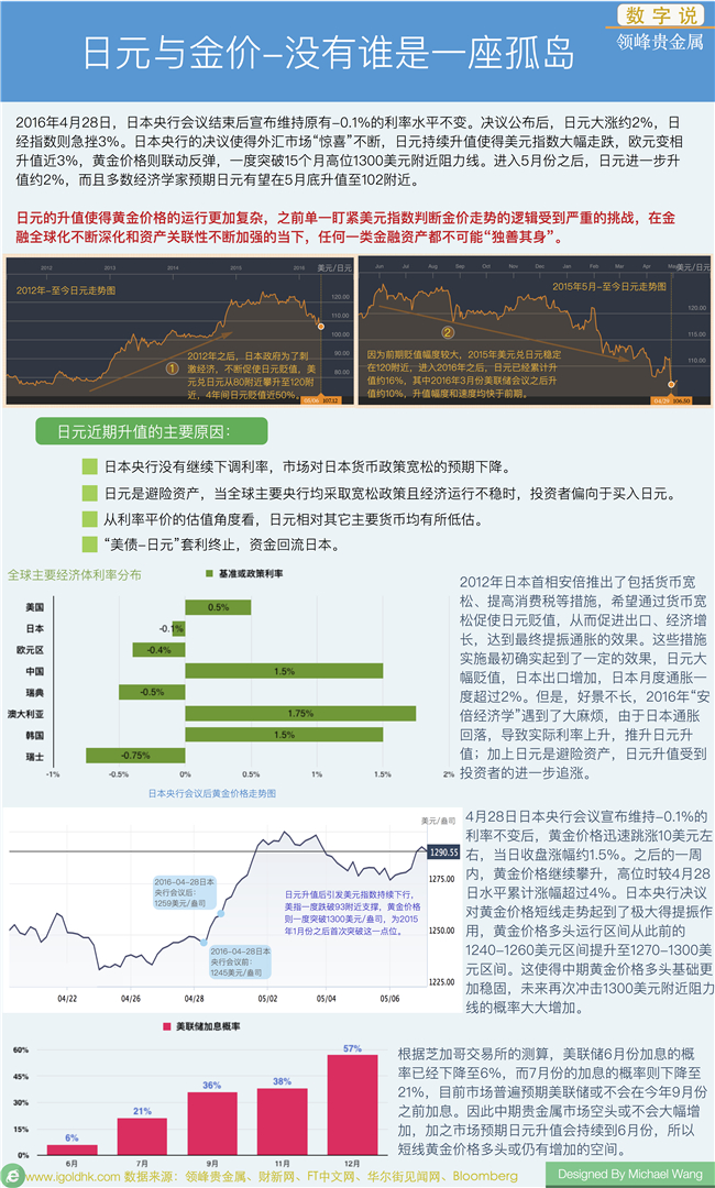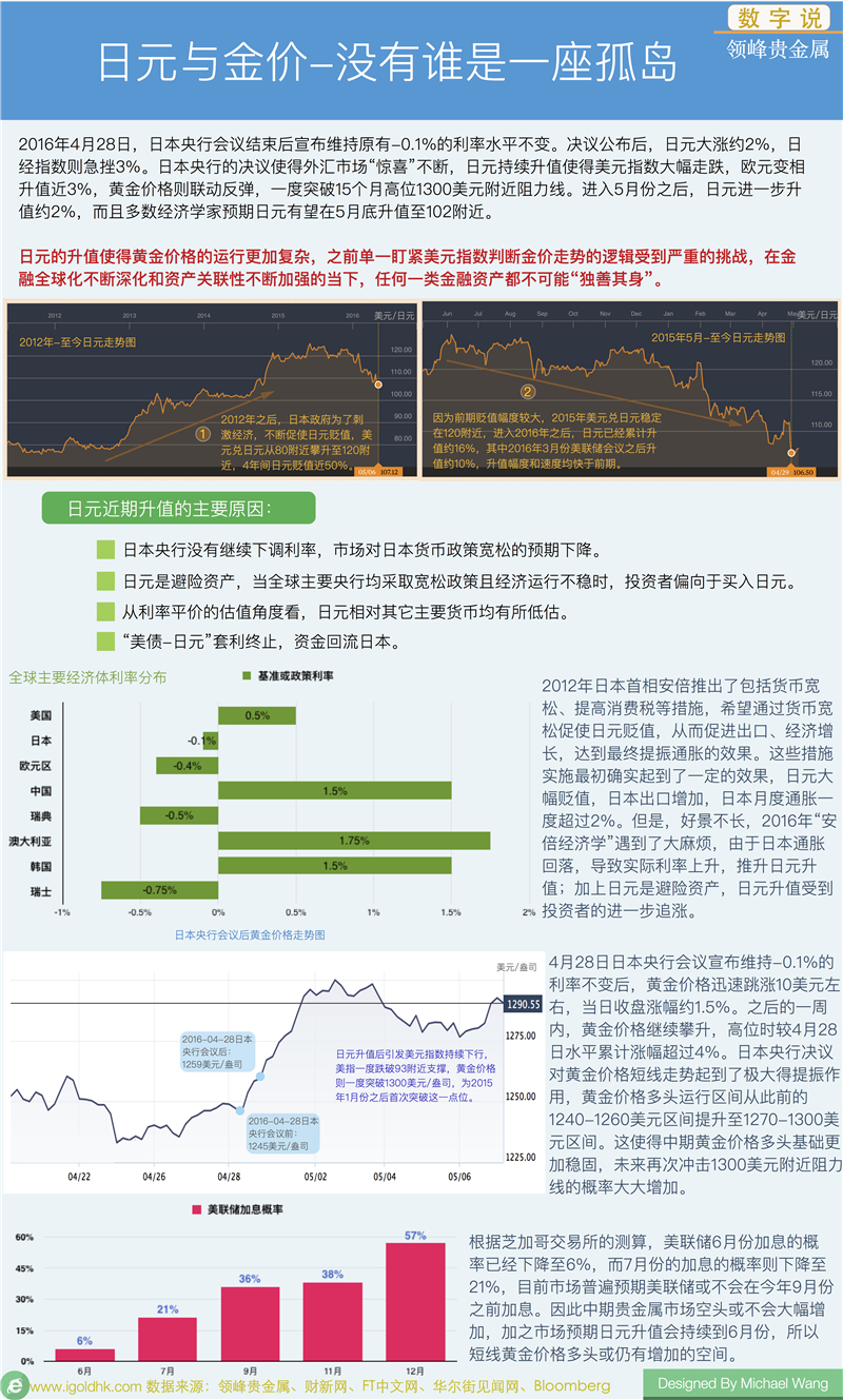 由于美元指数是参考一篮子货币所制定,其中日元比重位列第二,仅次于欧元,所以当日元升值时,美元相对贬值,美元指数也不断下行。从4月28日日本央行会议后,美元指数连续下行近5天,低位时一度跌破93附近支撑,刷新了15个月新低。美元指数的不断下行,则推升了黄金价格的不断上涨,黄金价格则从2015年1月份之后首次触及至1300美元附近强力阻力位。由此可见,日元升值对黄金价格的提振作用是非常明显的。
