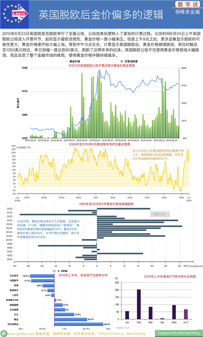 英国脱欧不仅扰乱了金融市场的短线运行,也将会从长期上使得贵金属市场多头继续增加。在分析英国脱欧对未来黄金价格走势的影响之前,有必要提醒投资者,在英国脱欧前黄金价格2016年上半年的涨幅已经逼近20%,即进入牛市行情。所以黄金价格此轮的反弹首先具有内生性,英国脱欧只是在这一基础上使得黄金价格多头未来持续偏多。支撑这一判断的理由有: