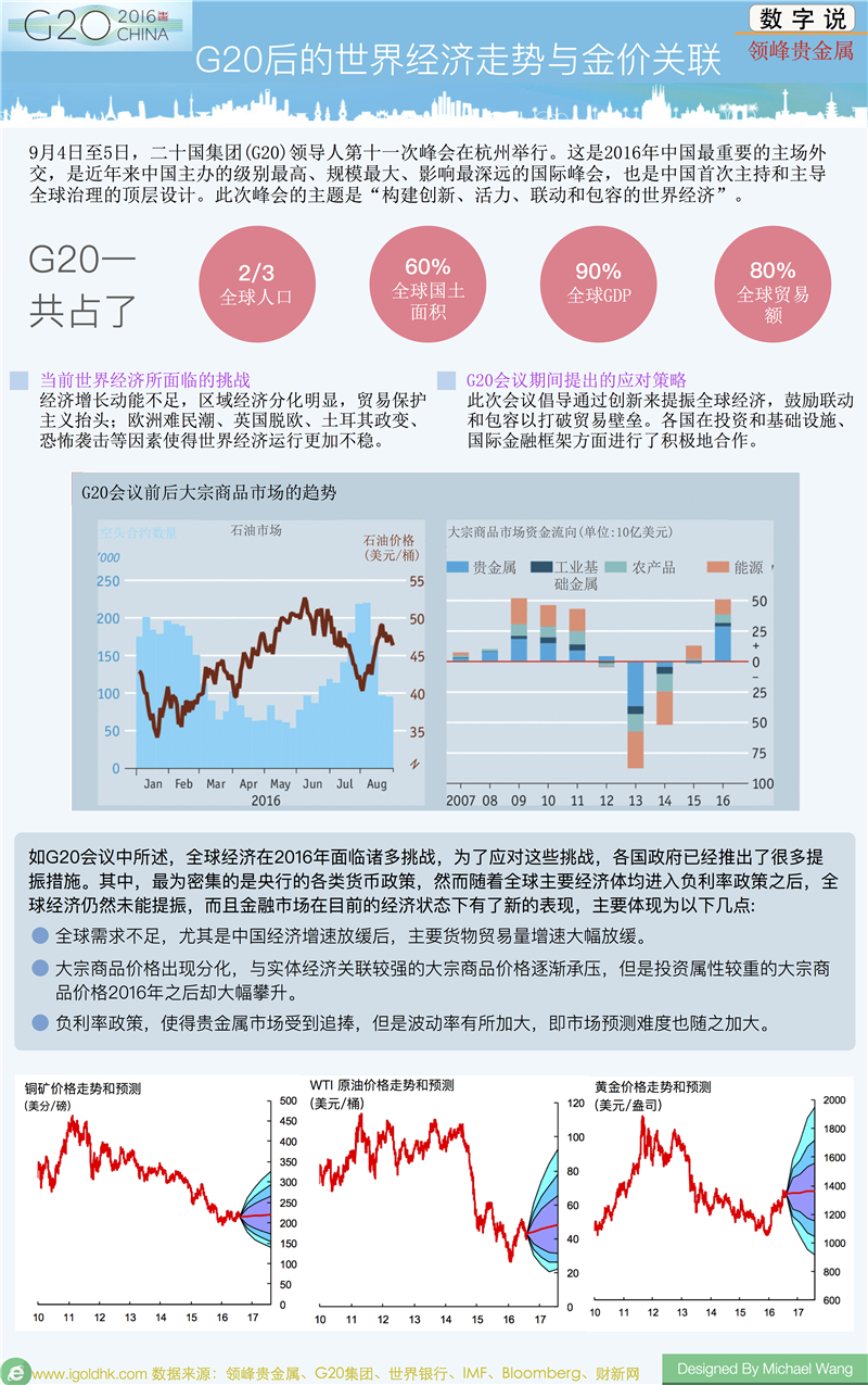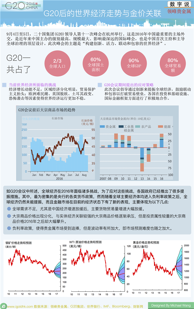 G20杭州峰会结束后,一系列协议和成果得以公布。作为协调目前全球经济的主要组织,G20集团在2008年金融危机之后发挥了重要的作用。随着全球经济进入后金融危机时代,一些挑战层出不穷。虽然爆发一次新的经济危机的概率较低,但是面对增长乏力的“新常态”,世界经济未来的走势如何,以及贵金属市场在其中的关联如何,将会是本篇专题的分析重点。
