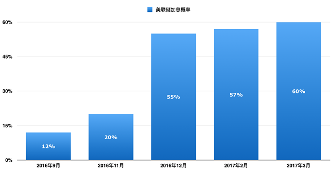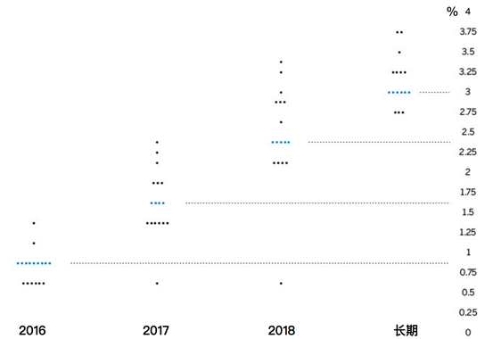 如上图所示,2016年核心通胀水平约1%,距离美联储2%的目标仍差1个百分点。美联储预测美国经济会在2017年底达到2%的通胀,按照美联储的利率模型,美联储会在美国经济达到2%的通胀时将利率水平提升至2-3%的水平。因此市场普遍预期美联储2016年应该会加息1次,2017年偏于加息两次。目前美联储的利率水平在0.25-5%区间,根据下图美联储提供的利率点阵分布图,美联储会在2016年将利率水平提高至0.75%左右,2017年提供至1.5%左右。