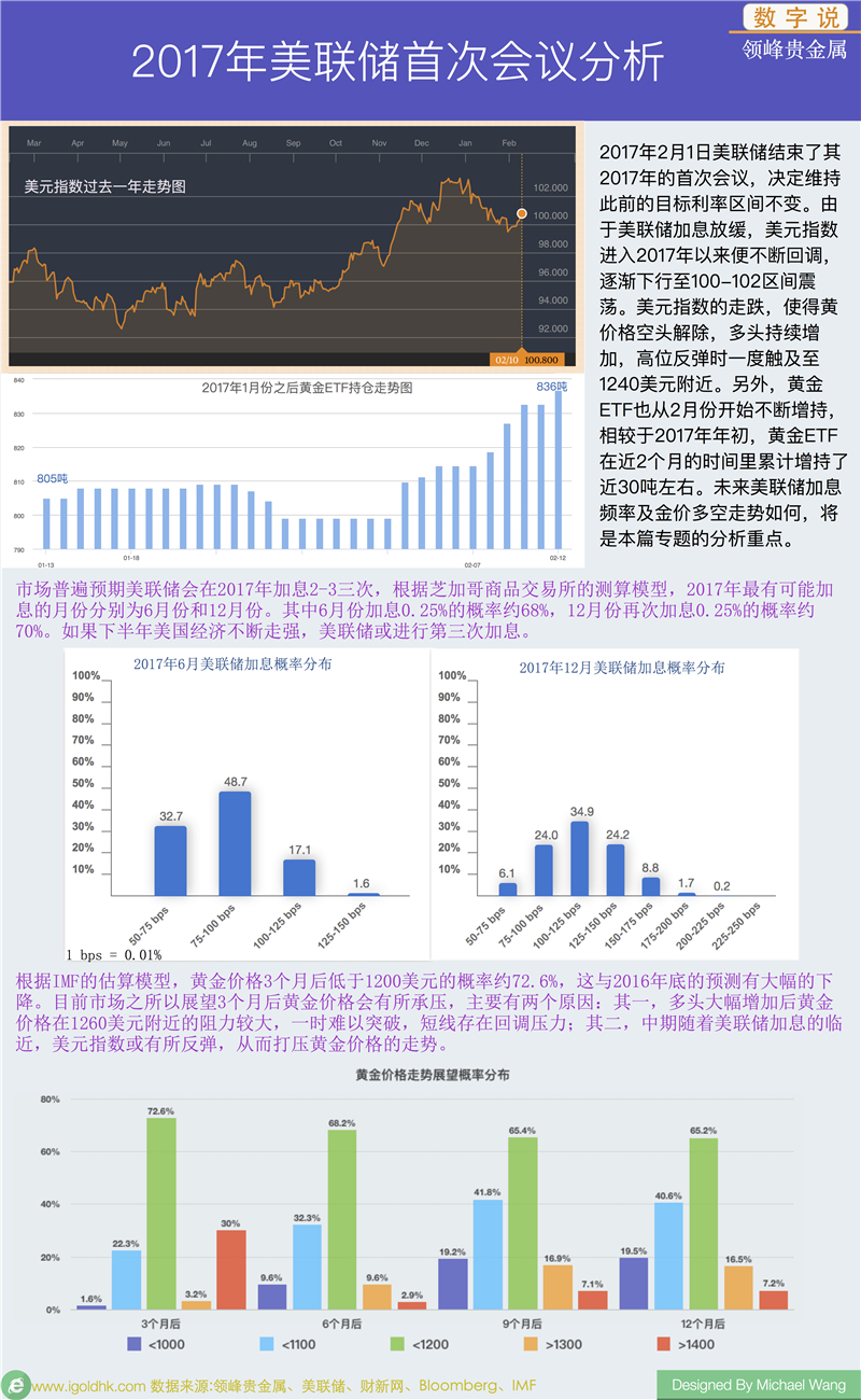 2017年2月1日,美联储结束了2017年的首次会议,会议决定维持此前0.5%至0.75%的利率目标区间不变,该决议符合市场预期。美联储表示,随着通胀向目标水平回升,今年将会“按既定计划进一步上调短期利率”,这意味着2017年美联储加息的速度或比之前快一些。本篇专题,我们将会对美联储2017年首次会议透露出的相关信息进行分析,并对金银价格未来可能的运行区间进行定位。