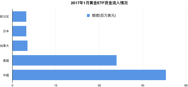 另外,个人投资者对黄金的追捧也有增无减。根据彭博的最新统计,2017年1月份大量资金流入黄金ETF。如下图显示,中国黄金ETF资金流入量最大,且超过了美国。黄金ETF资金流入量的增加,显示了投资者对黄金投资的认知度大幅上升,同时对其未来展望也偏于乐观。