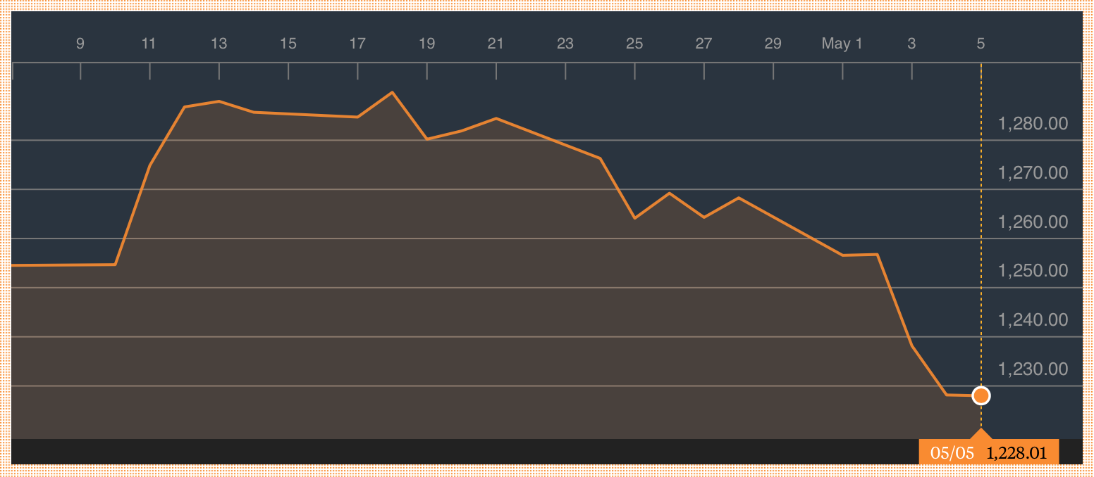 (过去一个月黄金价格走势图,单位:美元/盎司)