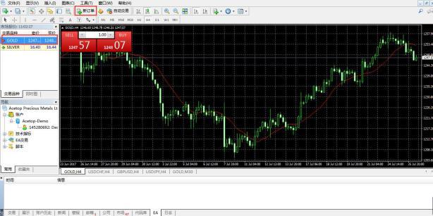 (2)打开Acetop MT4交易软件客户端,在登录账户后将进入主界面,双击交易品种中“GOLD”或者“SILVER”任一项或者单击工具栏上的“新订单”。