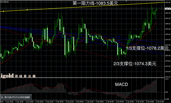 黄金阴阳烛录得后期阳烛增加,且高于红色日均线,短线MACD显示多头主导,黄金价格晚上或首先围绕1083美元附近震荡,如果持稳或进一步反弹至1085美元附近,低位空头信号可分阶段参考1080和1078美元附近。