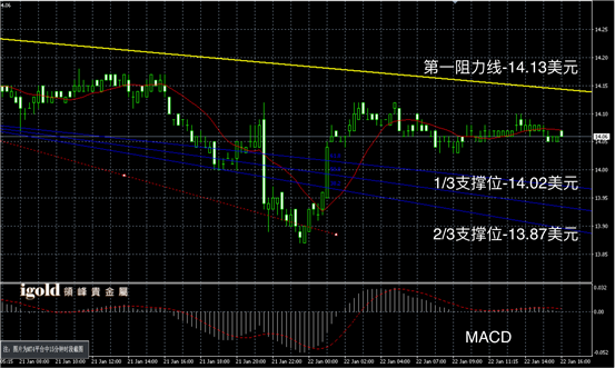 白银阴阳录得柱体聚焦在红色日均线中位,横盘运行趋势明显,短线MACD显示呈中性,白银价格晚上继续围绕14.05美元附近震荡,高低多空信号可分别参考14.15和14美元附近。
