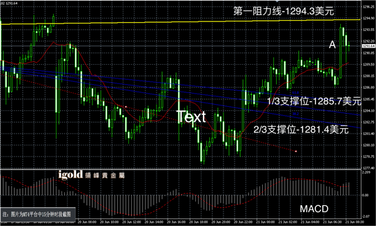 黄金阴阳烛录得后期阳烛反弹,末端高于红色日均线中位,短线MACD显示弱势多头主导,黄金价格上午或继续在1290美元以上持稳,高低多空扩大信号可分别参考1293和1289美元附近,短线运行可参考阳烛A的高低价。