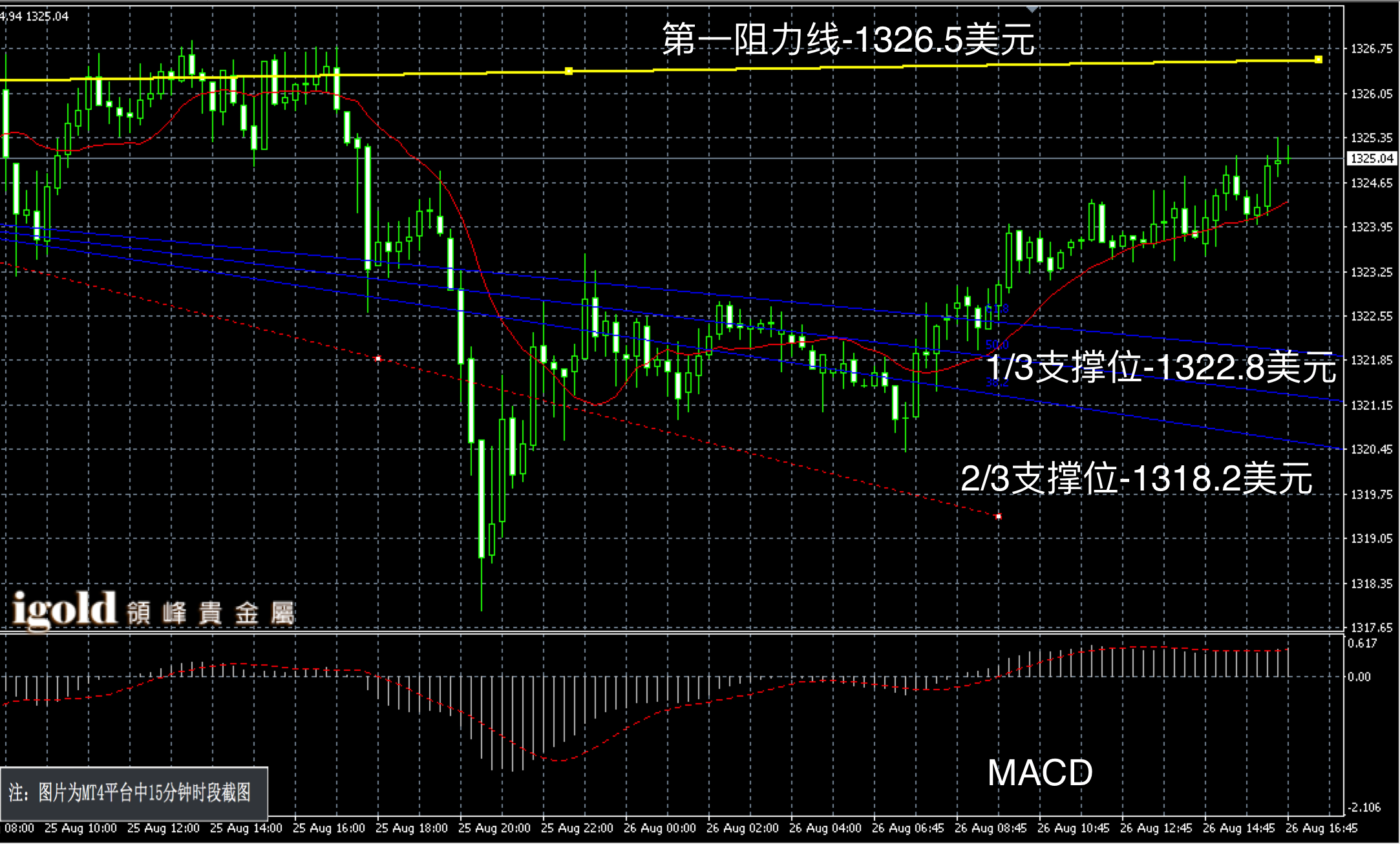 黄金阴阳烛录得后期阳烛反弹,末端高于红色日均线,短线MACD显示弱势多头主导,黄金价格晚上或继续在1325美元附近持稳,高低多空扩大信号可分别参考1327和1323美元附近。