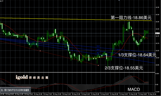 白银阴阳烛反弹后录得柱体较短,末端处于红色日均线中位,短线MACD显示弱势多头主导,白银价格晚上或小幅回调至18.75美元附近徘徊,高低多空扩大信号可分别参考18.85和18.65美元附近。
