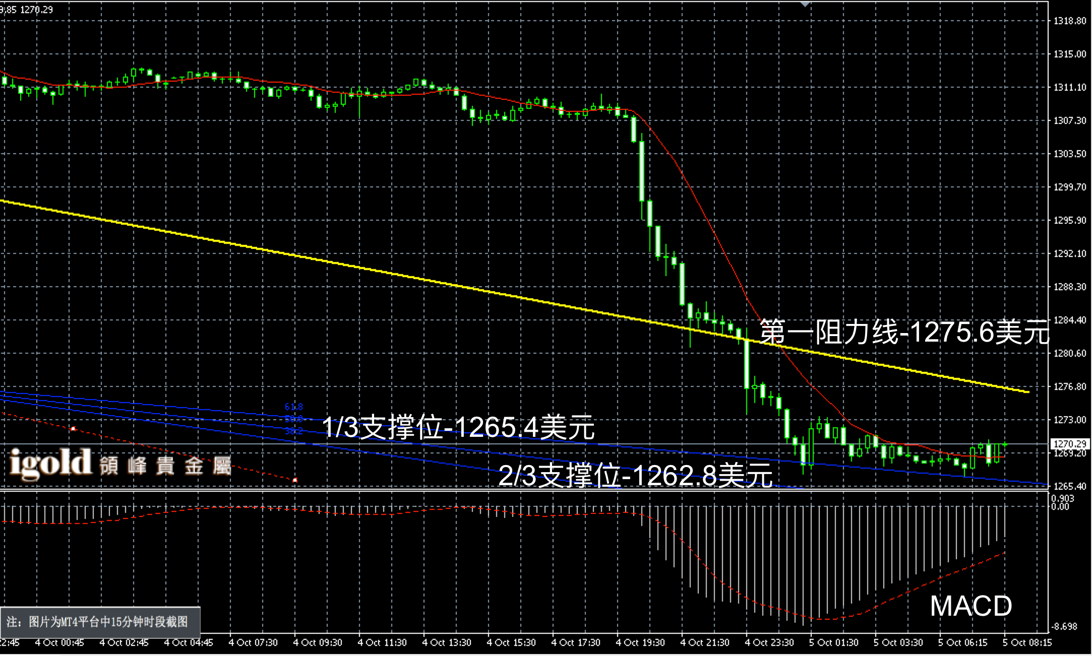 黄金阴阳烛录得下行后柱体收短,末端处于红色日均线中位,短线MACD显示空头主导,黄金价格经过此次下行调整后,短线或已经触底,而且存在一定的超卖。黄金价格上午或偏于持稳在1271美元附近,高低多空扩大信号可分别参考1273和1268美元附近。
