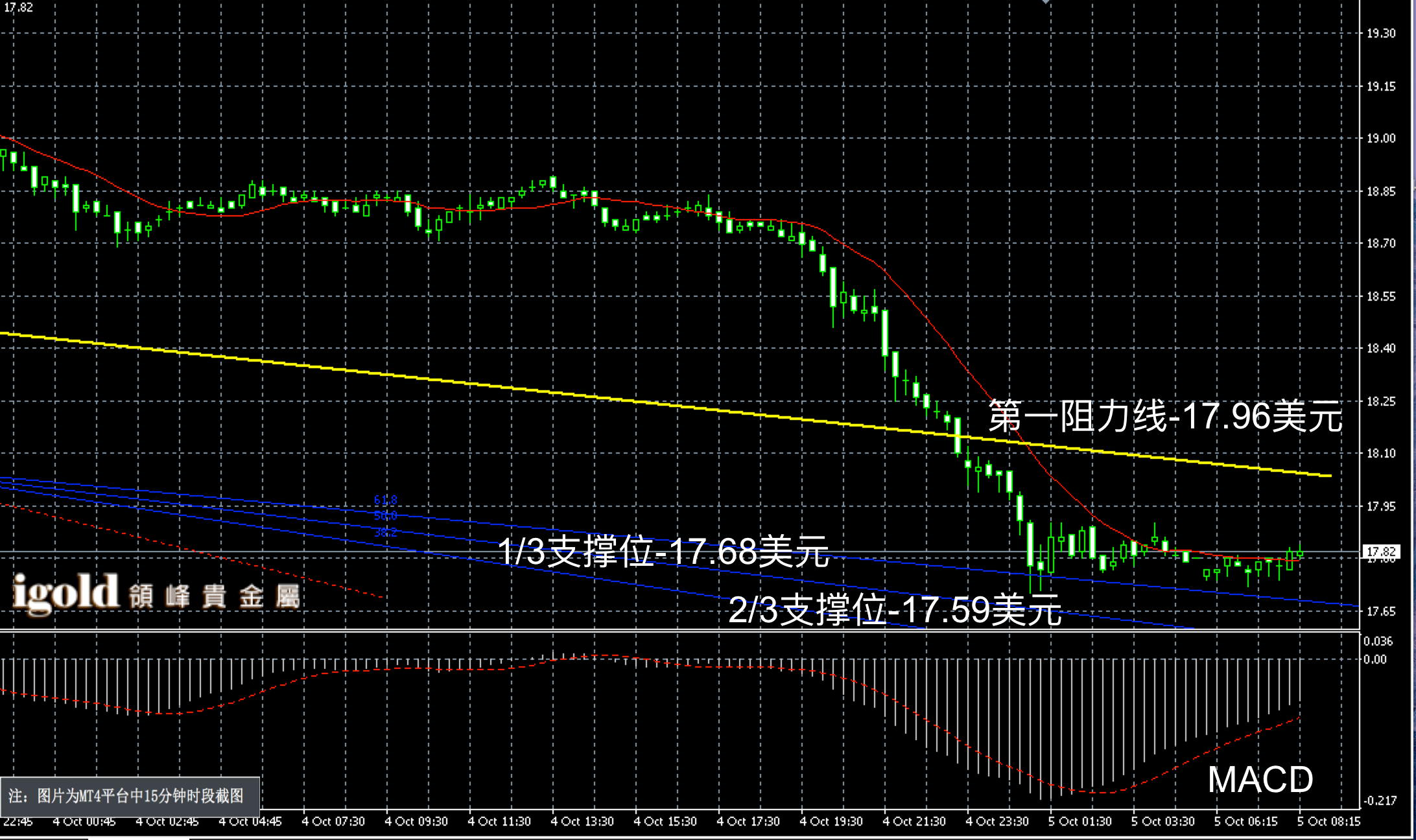 白银日线末端同样录得阴烛大幅下行,柱体低于红色日均线中位,长线MACD显示弱势空头主导,RSI录得29,区间下行,小时线上阴烛回落后柱体收短,短线进入超卖区间,白银日线或下行至17.65-18.35美元区间运行。