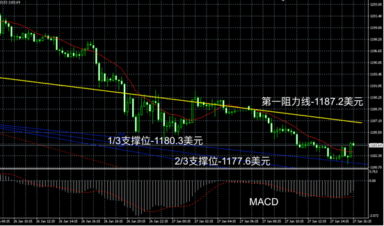 黄金阴阳烛下行后柱体收短,末端处于红色日均线中位,短线MACD显示弱势空头主导,黄金价格晚上或在1184美元附近徘徊,高低多空扩大信号可分别参考1186.5和1180.7美元附近。