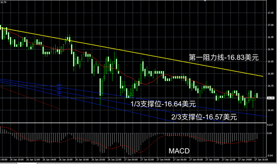 白银阴阳烛录得后期阴烛回落,末端处于红色日均线中位,短线MACD显示弱势空头主导,白银价格晚上或在16.7美元附近徘徊,高低多空扩大信号可分别参考16.85和16.63美元附近。