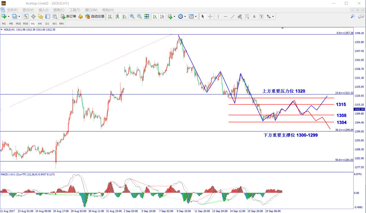 国际现货黄金周二(9月19日)整体小区间震荡走势,小幅反弹后又下跌,美盘中最高上探至1310.63美元/盎司,最低下探至1305.08美元/盎司,全天按昨日预期维系在1305-1310美元区间内小波幅震荡,市场如预期观望气氛浓厚。今天全球金融市场将迎来堪称美联储今年“最重磅的会议”,尽管加息可能性微乎其微,但美联储可能会开始宣布缩减资产负债表,这将是一个具有“历史性意义”的决定,必将对金融市场产生深远影响。因为缩减资产负债表会降低储备货币规模,从而影响基础货币,是流动性收紧的标志。相比加息,缩表更加直接,影响力也更大。更重要的是,缩表标志着美联储全面收紧货币政策,对市场风险情绪的打击将极为显著。由于美联储缩减资产负债表规模的努力是前所未有的,预测市场对美联储可能的声明反应时,可能会显得比较混乱,市场波动性因此可能会相当高。
