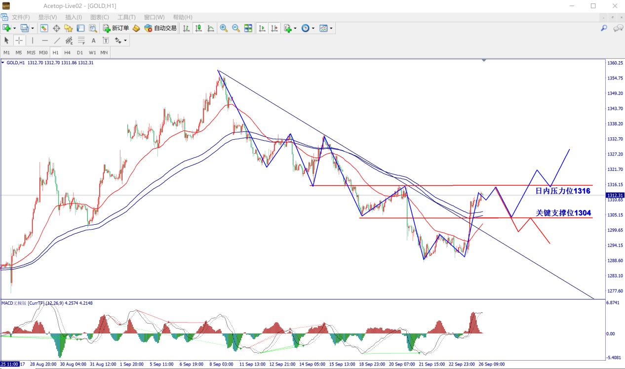 激进:1310附近做多,止损3美金,目标1313-1316-1321-待定。