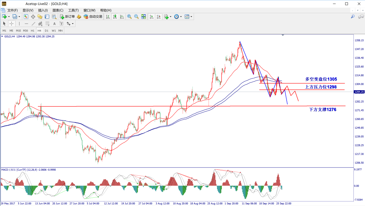 今日亚盘初期,金价一度触及1290.67美元/盎司低位,随后逐步反弹至1296美元附近。日线图中,昨日大阴线导致今日重回偏空趋势中,昨日自1313附近回落后,MACD绿色动能柱出现二次放量迹象,于BOLL中轨下方运行,RSI指标二次拐头向下,4小时周期均线于K线上方形成粘合压制,MACD绿色动能柱开始放量,处BOLL中轨下方,但BOLL出现走平现象,1小时周期均线空头发散排列,MACD绿色动能柱缩量零轴。目前多周期呈空头排列走势,今日建议投资者上方关注1298-1300一线压制,不能上破整体以高空操作节奏为主。加之今日市场焦点有特朗普的税改“详细税改大纲”公布在即,对于市场冲击必然不小,个人认为企业税只要低于25%,对于黄金的利空情绪都将表现明显,届时需重点关注。同时还有一系列重要经济数据和多位美联储官员的讲话。