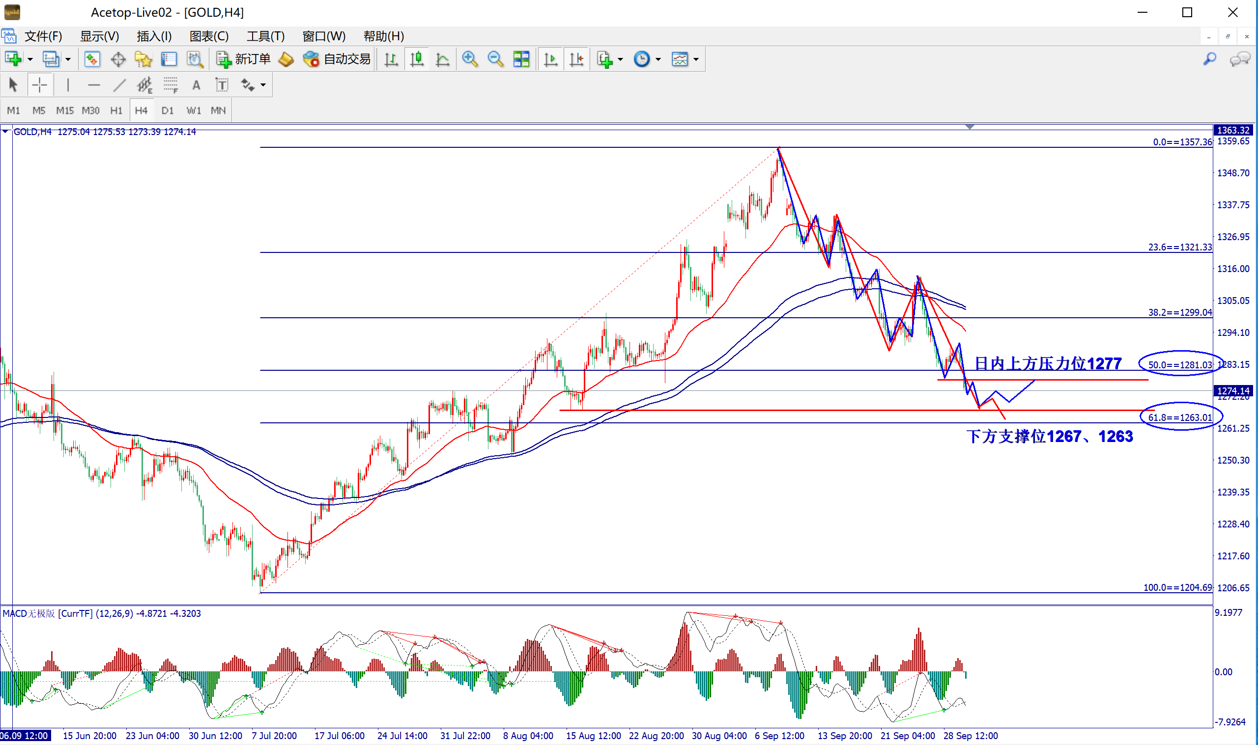 日线图中金价于上周五刺透1280美元/盎司关键支撑位,今日亚盘成功下破该位,MACD绿色动能柱无明显缩量,处BOLL中轨下方,RSI指标处超卖区域,4小时周期短期均线于K线上方形成粘合压制,MACD绿色动能柱开始放量,处BOLL下轨附近,1小时周期均线上方形成压制,MACD绿色动能柱小幅缩量。黄金早间持续弱势走低,目前日线、1H周期依然偏空,整体交投于1274美元/盎司关键支撑位附近,但4H周期看后期黄金下跌空间可能有限,提防后期出现大反弹,故建议投资者日内反弹短空操作为主。