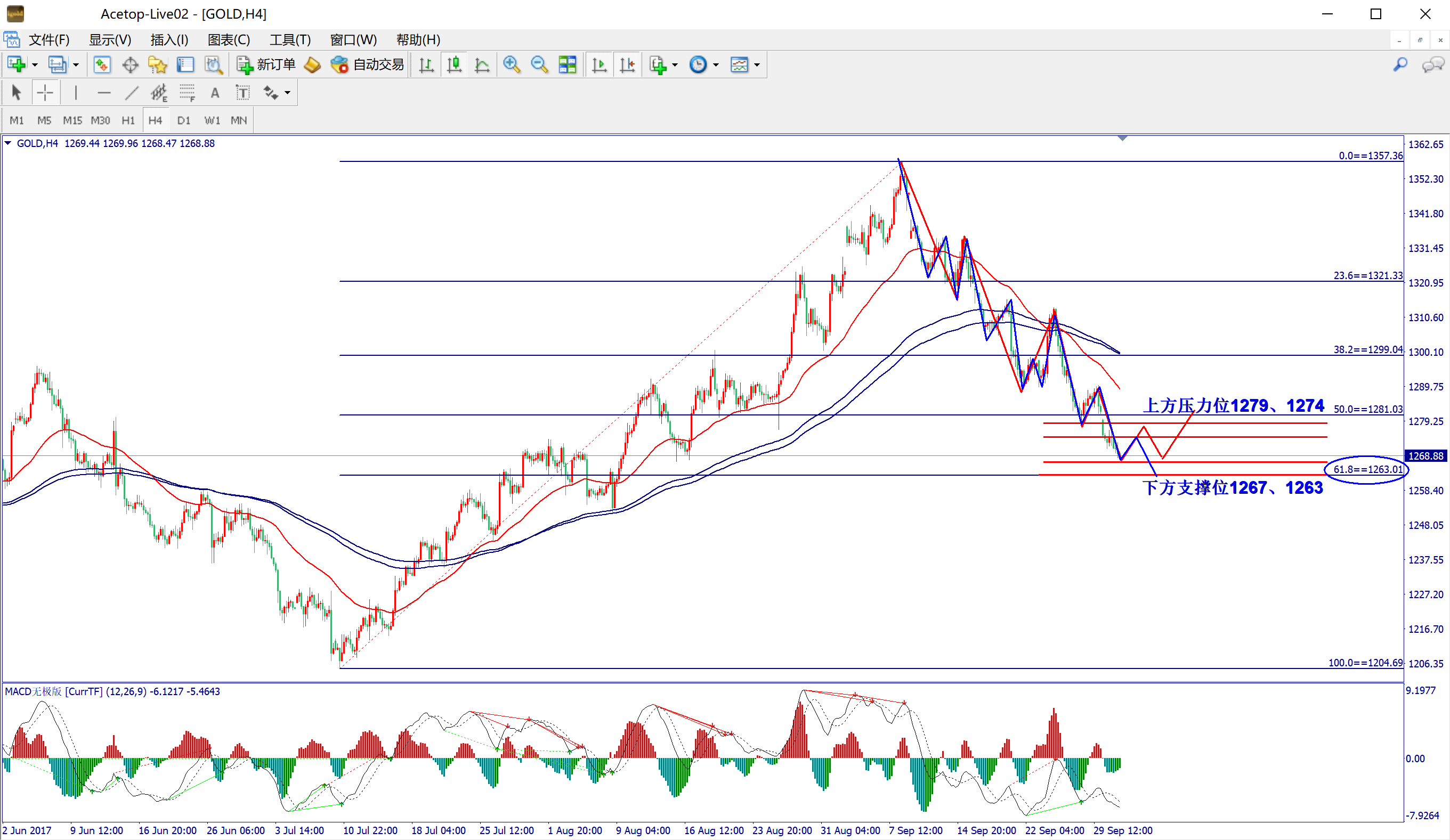稳健:1263附近轻仓短多,止损3美金,目标1267-1270-1274附近。