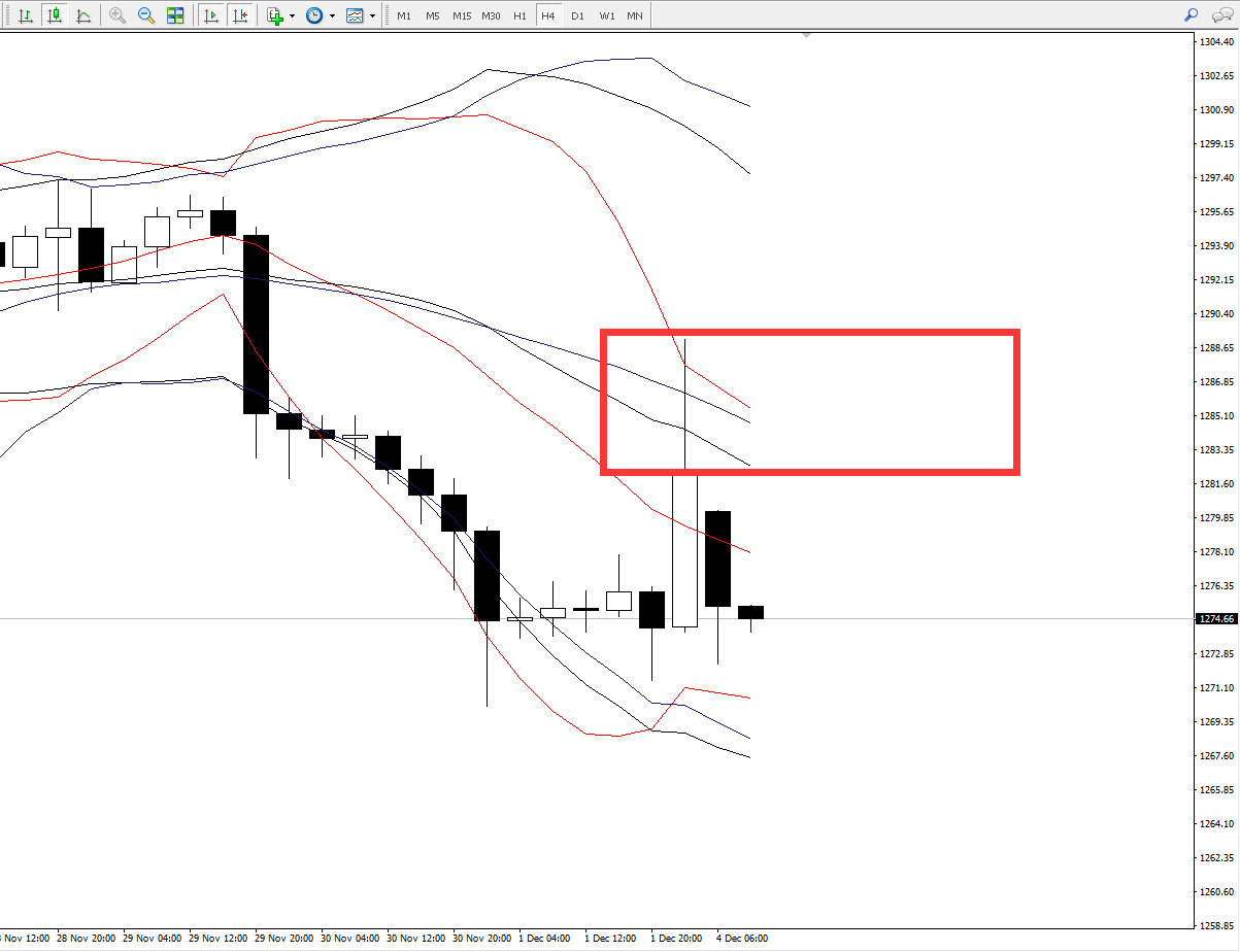 4小时图上,目前周期分别为14、21、26布林轨的中轨区间1282-1286在短线上已经形成一个有效的压力区间,短线上价格若能反弹到这一带,可考虑进行空单的布局。