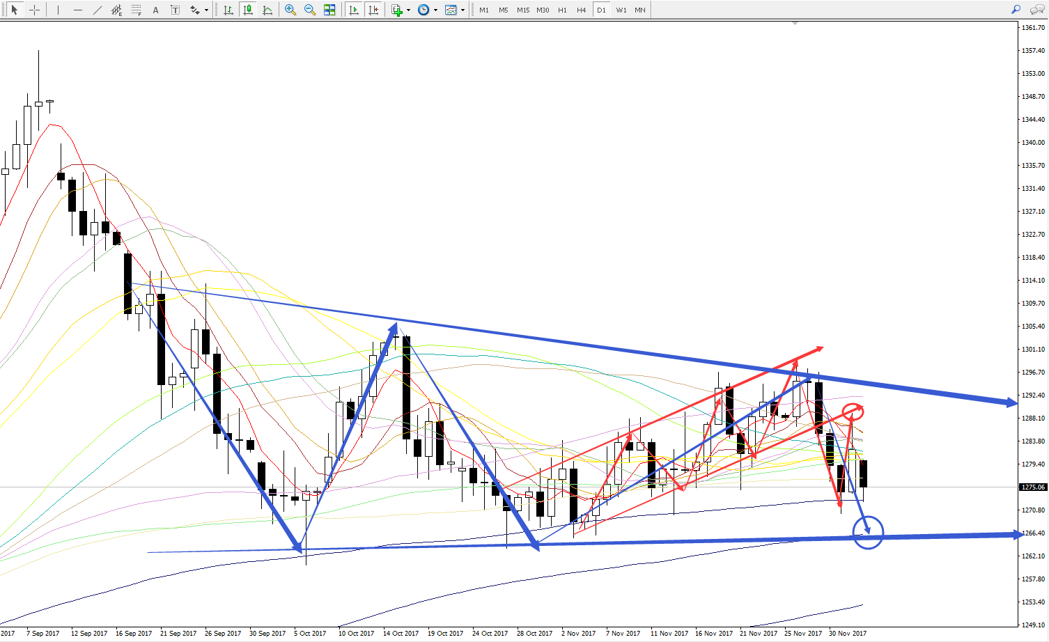 从1小时图来看,目前价格要重点关注1270一线的支撑情况,若有效打破,那么前面的这一波上拉行情技术上则可认定为是一波诱多行情,而且若有效打破,MACD将会出现一个明确的空头信号,价格也将进一步下探去测试下方的一些关键支撑位。