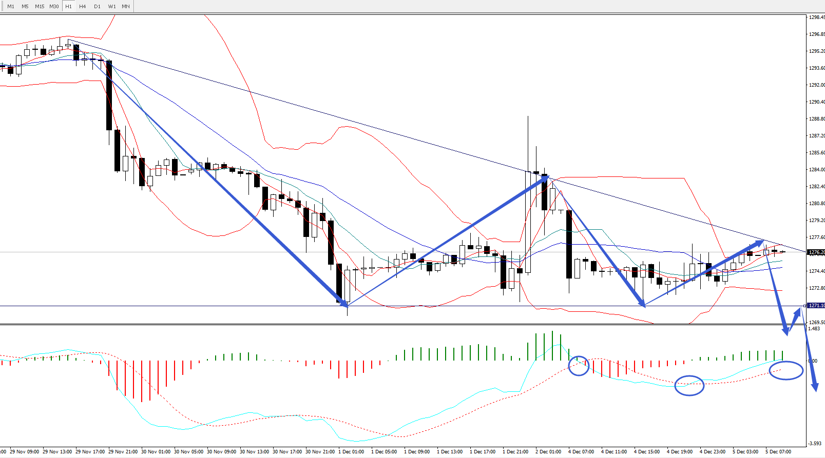 从1小时图来看,目前价格仍运行于三角整理的结构当中,要重点关注价格的一个破位情况,目前MACD的快慢线仍旧运行于零轴下方,日内量柱若能同时翻到零轴下方,且价格同时有效下破1270一线,那么上周五的大幅上拉行情技术上则可认定为是一波较强的诱多行情,价格也将进一步下探去测试下方的一些关键支撑位。