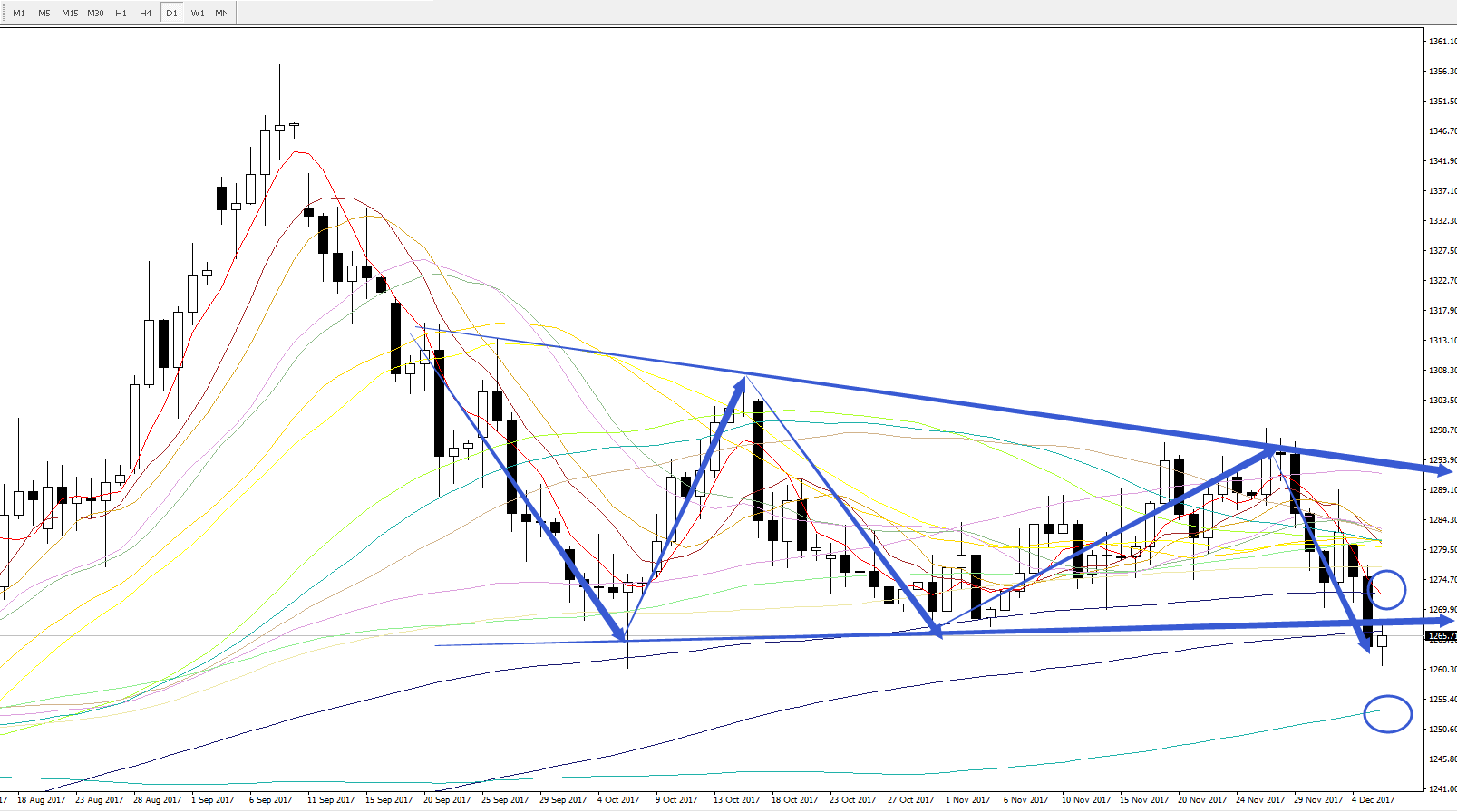 日线图,目前价位要重点关注大级别整理结构的一个运行情况,虽然昨日已被顺利击穿下轨,但是否属于大级别的一个有效下破,还要关注今天日线的一个收线情况。上方重点关注200日均线与5日均线的交叉位置1272美元一线,下方重点关注300日均线的支撑1253.5美元一线。